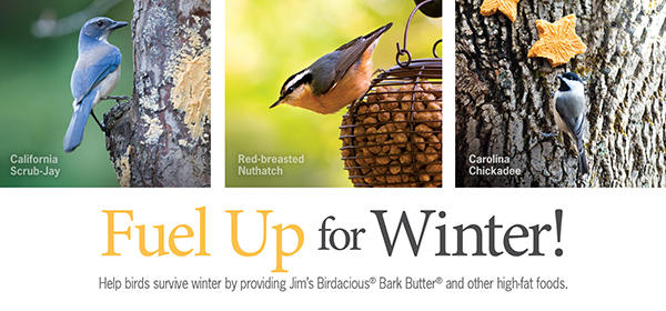 You can help by providing high-fat foods like Jim's Birdacious® Bark Butter®, Bark Butter Bits and Bugs & Bits®. Shop now and save on all Bark Butter products - they're perfect for providing your birds with much-needed nutrients.